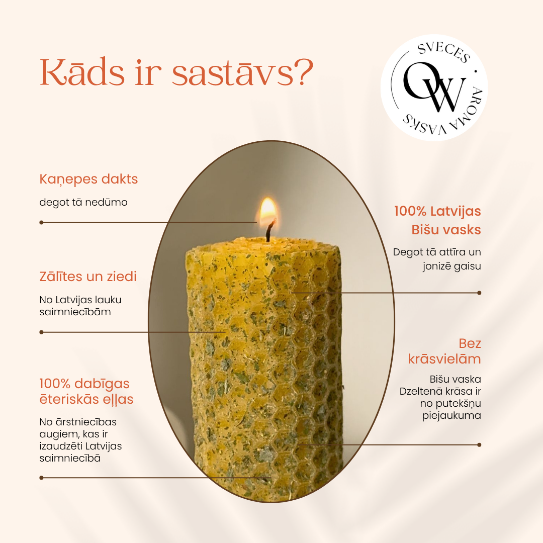 Sastāvs: 100% Latvijas bišu vasks, kaņepes dakts, Latvijā ražota ārstniecības Salvijas ēteriskā eļļa un Ābolmētras zālīte.
